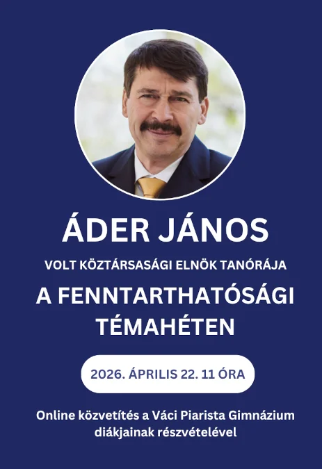 Áder János volt köztársasági elnök, immár hagyományként, az idei Témahéten is tart tanórát, amelyre 2026. április 22-én, szerdán 11-kor a Váci Piarista Gimnázium diákjainak részvételével kerül sor. A tanóra élőben is követhető a Fenntarthatósági Témahét weboldalának nyitóoldalán, a tanóra nyitóképe helyén, továbbá felvételről utólag is bármikor megtekinthető. A rendkívüli tanóra megtekintését elsősorban a 7–8. évfolyamos és a középiskolás korosztályba tartozó tanulók, valamint tanáraik számára ajánljuk.